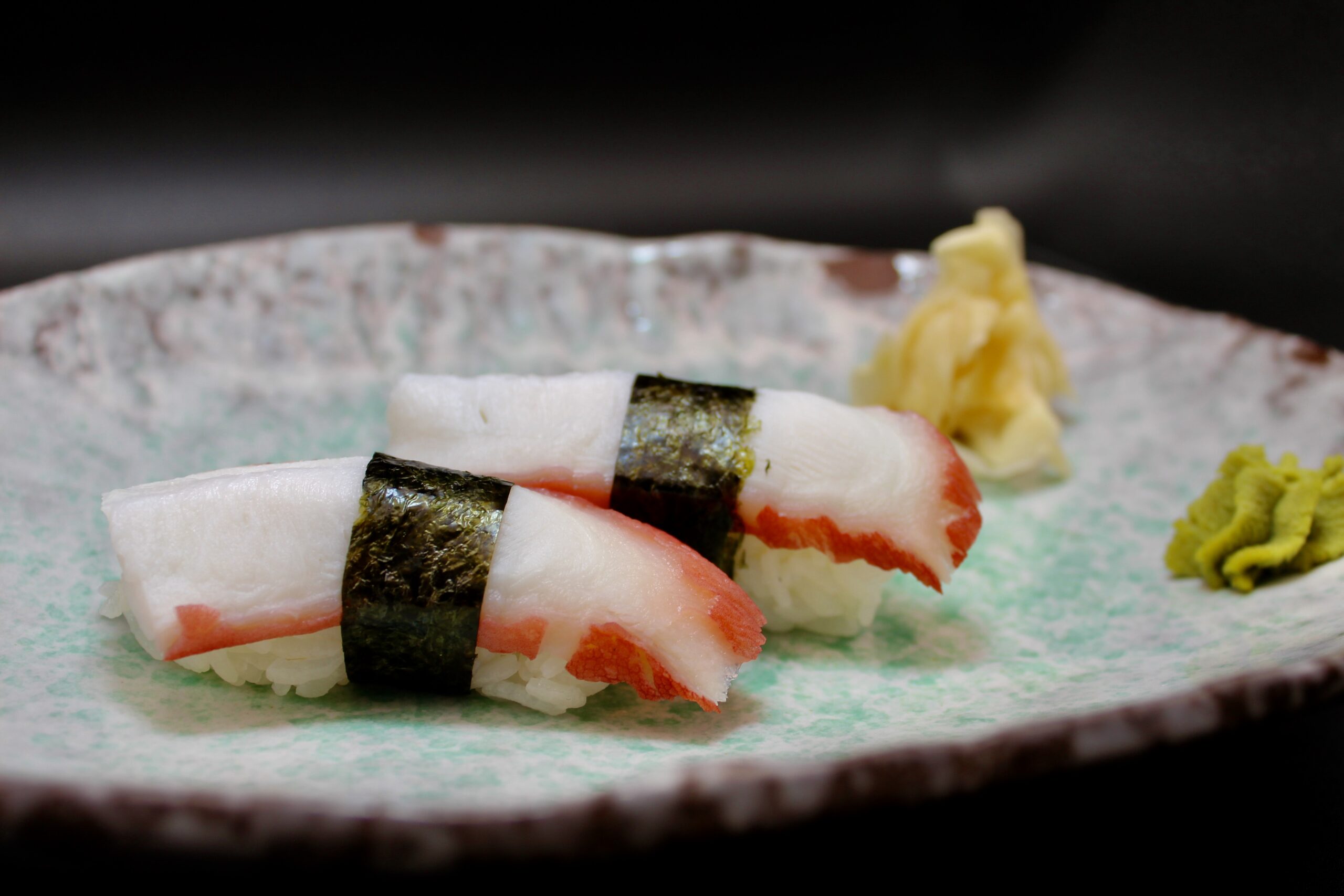 Shrimp Avocado filled with cream cheese, inside pancko fried, topped with mixed crab nigiri